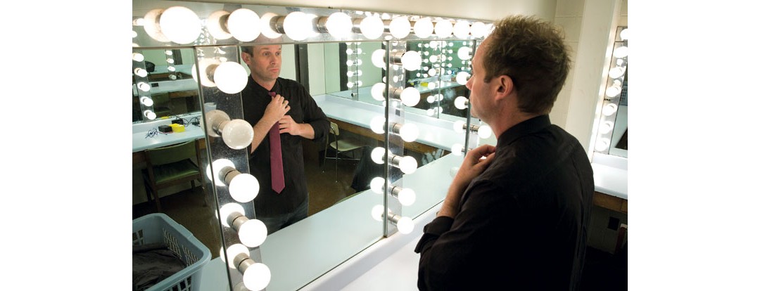 A man with spiked blond hair dressed all in black except for his pink tie steps out from the back of the stage. He doesn’t say a word. He raises an eyebrow as he looks at the audience. Then he steps down to the crowd of college students and points to his first volunteers.