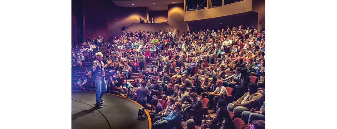 A countdown ticks on a screen in the front of a dark auditorium. Tension-building music blasts slowly at first, then speeds up. Before the performer appears, his voice bellows through the speakers: