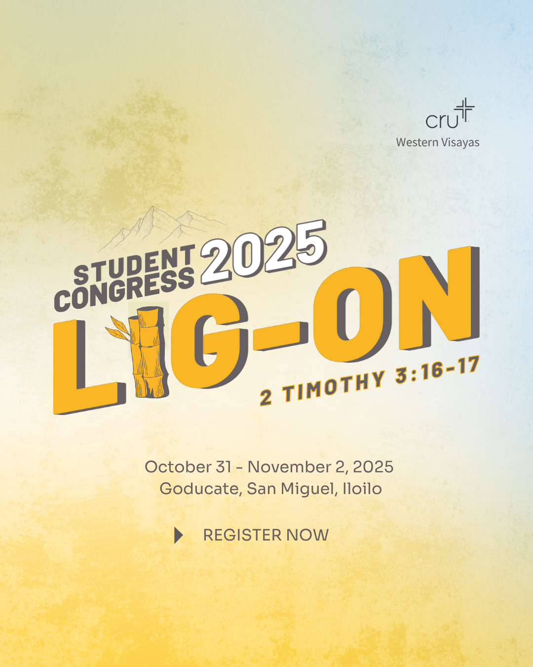 Cru Western Visayas invites you to Student Congress 2025, a dynamic three-day leadership training. This is more than just a gathering—it's an opportunity to deepen your faith, sharpen your skills in evangelism and discipleship, and be empowered to lead on your campus and in your community.